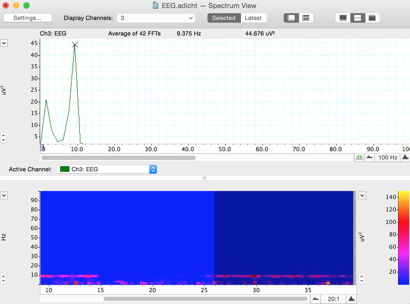 - Find the part of the recording when the volunteer had his/her eyes shut. Click-and-drag across this part of the raw data trace to select it. From the Window menu, select Spectrum. In the Spectrum View choose Selected (Figure 11).