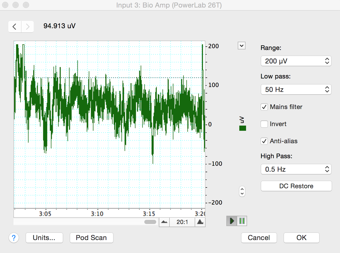 Make sure that the EEG channels are set to the “Bioamp”. Make sure the settings are as follows: Range 200 \(\mu\)V, High Pass 0.5 Hz, and Low Pass 50 Hz (Figure 4). Check that the spectral input is reading the channels for the EEG. You may have to change the inputs to match the correct channel number. If you are using the new setup, you may have to change and restart Chart (several times) with the Bioamp cable connected for it to appear in the menu. If you are using the old setup, the little green light on the front of the Bioamp should be on. Ask your TA for help if needed.