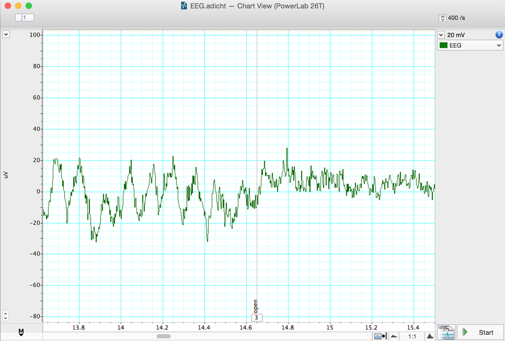 - In Chart View scroll through the “eyes shut” recording to look for alpha waves. Use the View Buttons to change the horizontal compression if necessary. The alpha waves can be recognized by their amplitude (usually 30 to 50 \(\mu\)V peak-to-trough, although it can be quite variable) and their frequency. Each cycle of an alpha wave should last approximately 0.1 s.