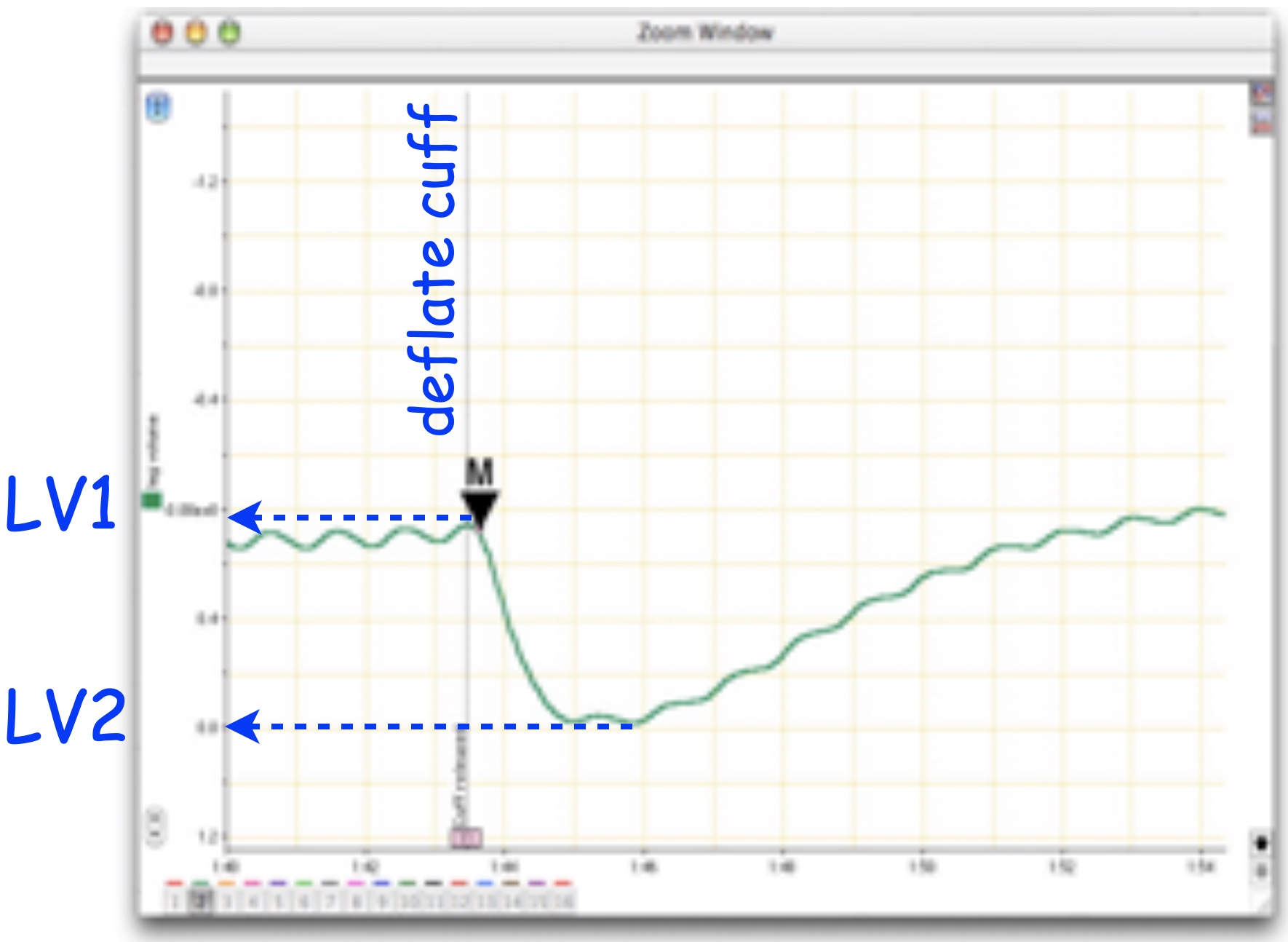 - Using the Waveform Cursor, obtain the difference in leg volume between maximum and minimum leg volume (\(\Delta LV\) (mV) \(= LV1 - LV2\); Figure 5). Note the maximum and minimum should be just before and a little after the cuff is deflated.