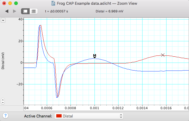 Room temperature. Using the data in Exercise 1, make a selection in channels 1 and 2 that includes the CAP. Open the Zoom window, and use the Marker and Waveform Cursor to determine the time interval for the CAP to travel between the two recording electrodes (Figure 12). Place the marker on the first CAP peak.