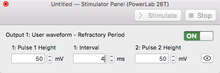 2. From the Stimulator dialog, select waveform> Refractory Period, and close the Stimulator dialog. 3. Open the Stimulator Panel if you have closed it and enter the voltage above in the pulse height for both pulses.