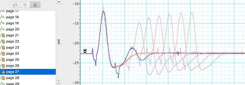 - Use the Waveform Cursor to measure CAP amplitude at each stimulus voltage. Fill in Table 1. Each block of data is represented as a page and has a different stimulus voltage shown in channel 3. Note the stimulus level where the first CAP is seen, and where maximum CAP is reached.