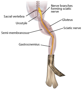 - From the dorsal side, using a glass hook and/or glass probe, locate and lift the sciatic nerve free from the associated fascia and the sciatic artery. Use blunt dissection techniques, and do not pull or damage the nerve. Also do not touch the nerve with metal.