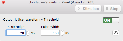 - Enter the stimulus amplitude (pulse height) that elicits the minimum observable response in to the Stimulator Panel dialog. This is the threshold voltage.