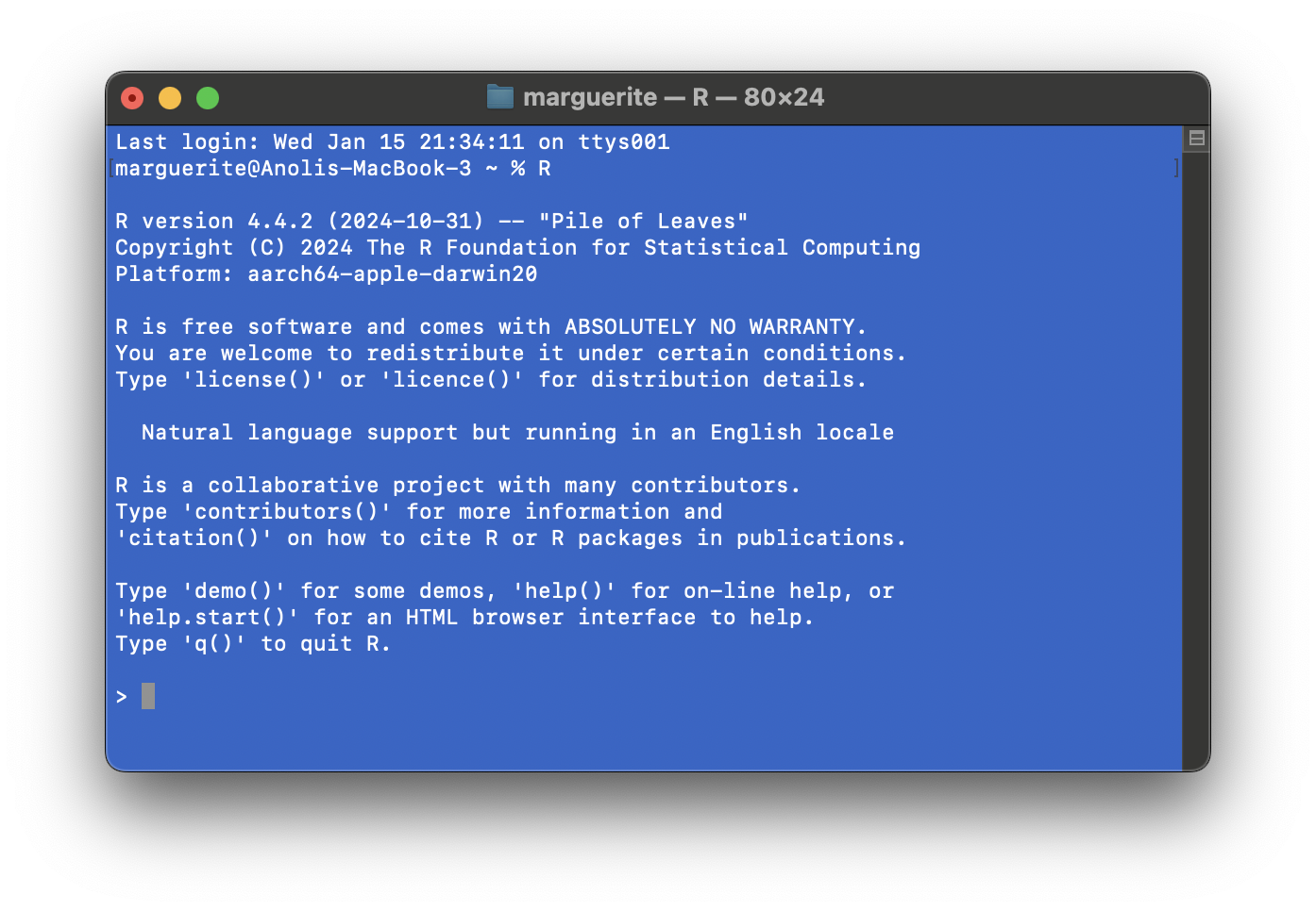 Please make a folder for your work in a convenient place and call it “Rclass”. On a Mac you may want to put it in “Documents”. Start by navigating into your Documents folder or other such folder where you want your Rclass work to be saved. cd is for change directory, and the syntax is cd Foldername: