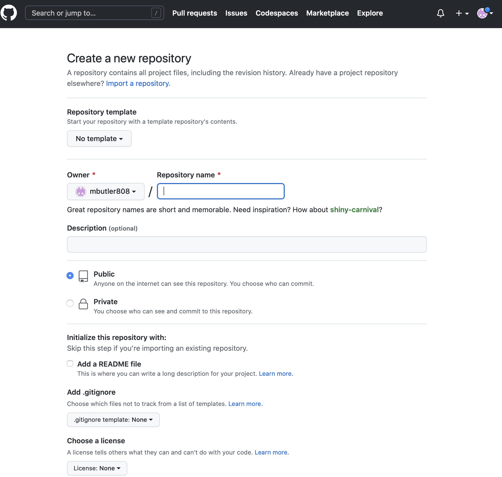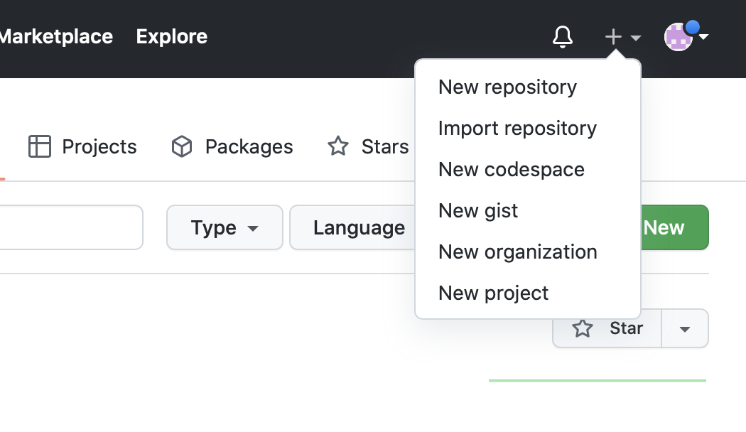 Documents/gitdirectory calledtestand copy some files there. - Go to your GitHub account and create a new repository. Click on the small black + on the top right corner