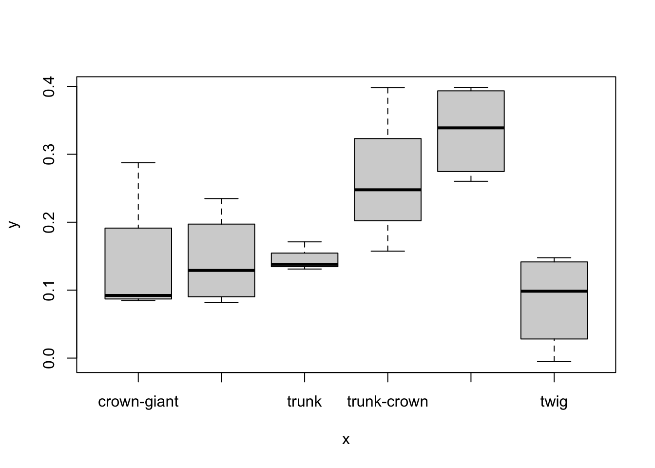 read.csv("anolisSSD.csv") # look for the file in the working directoryThis is an Anolis lizard sexual size dimorphism dataset. It has values of dimorphism by species for different ecomorphs, or microhabitat specialists.