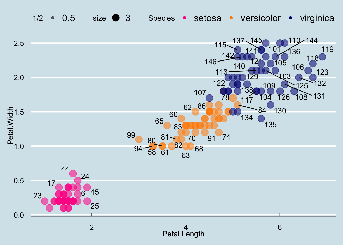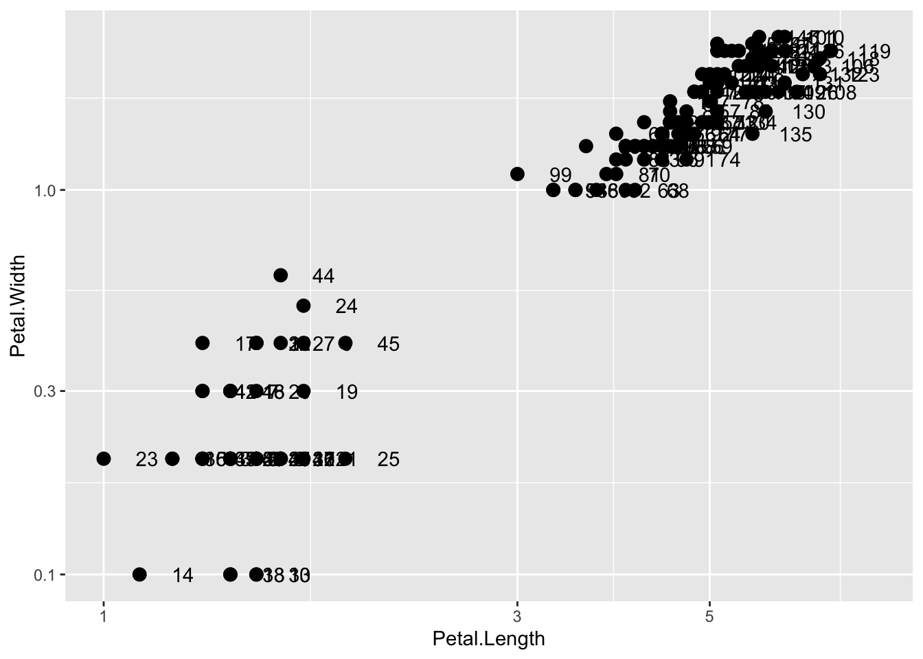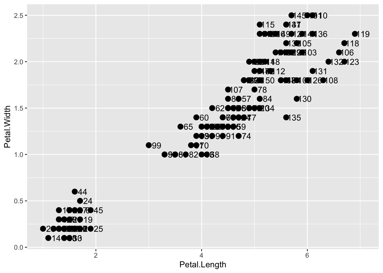 geom_text_repel(aes(Petal.Length, Petal.Width, label = id))Warning: ggrepel: 90 unlabeled data points (too many overlaps). Consider