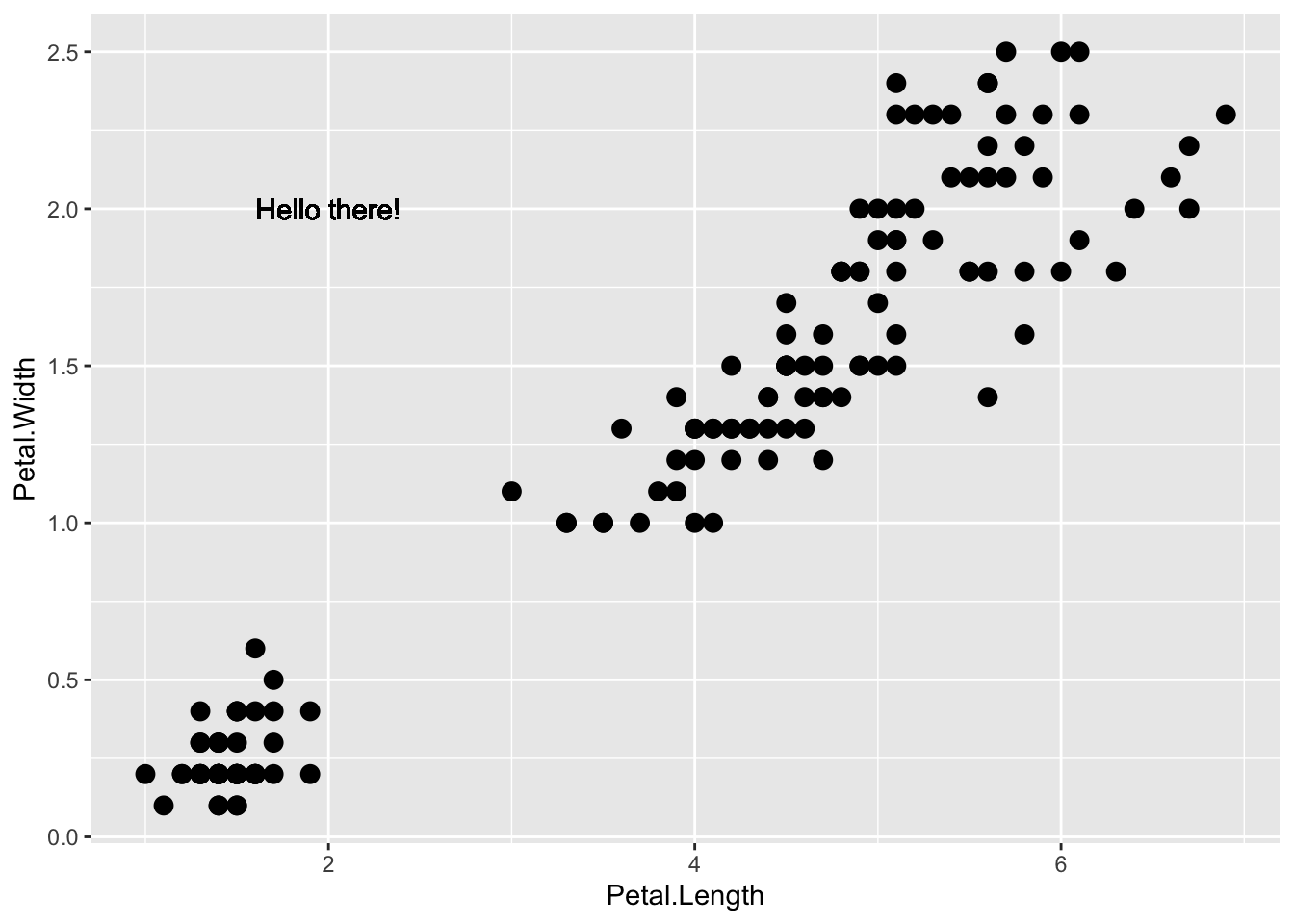 geom_text(aes(x = 2, y = 2, label = "Hello there!"))Warning in geom_text(aes(x = 2, y = 2, label = "Hello there!")): All aesthetics have length 1, but the data has 150 rows.