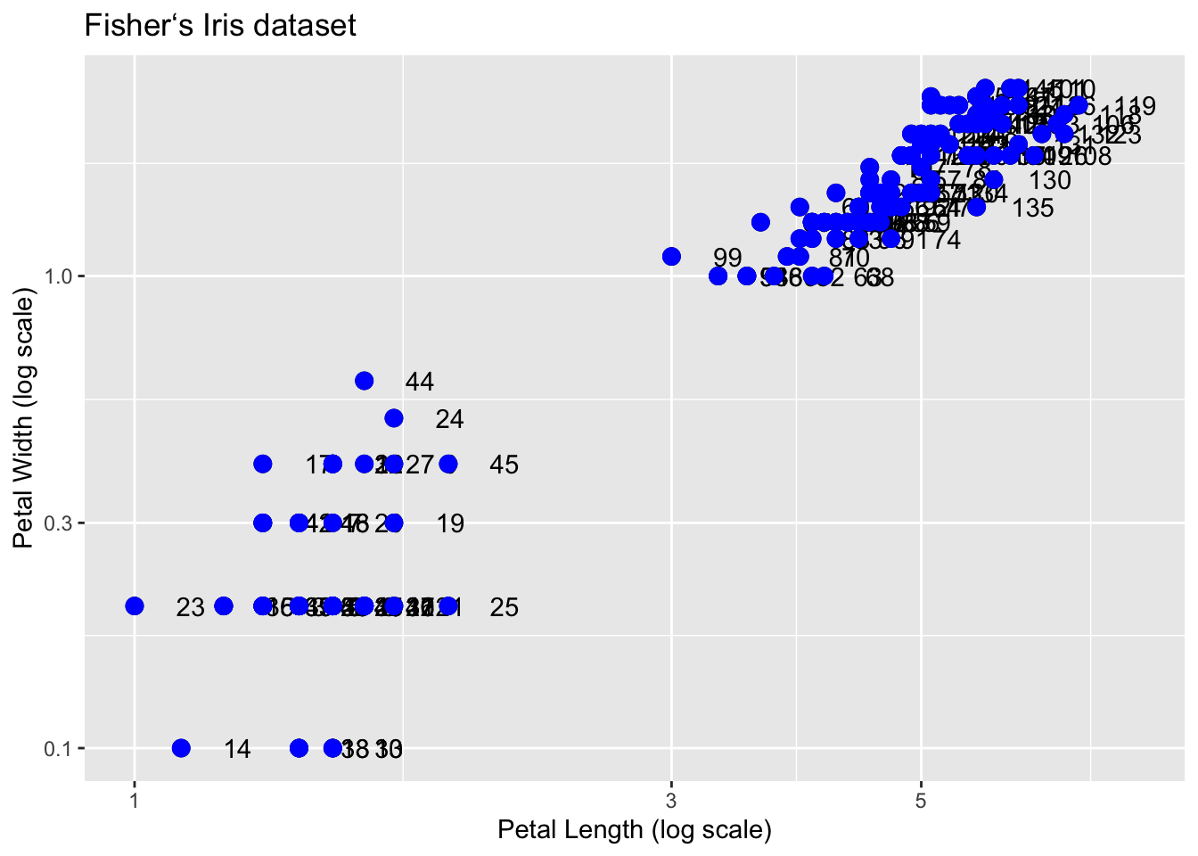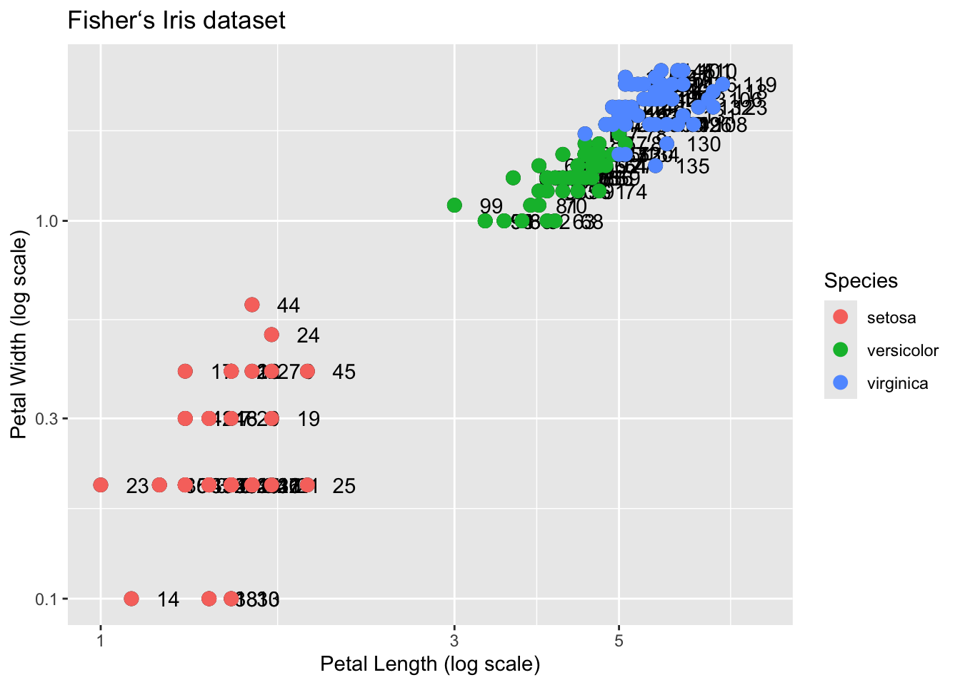 Suppose we wanted to label each point on the plot. First we add numbers to the iris data and remake the ggplot object: