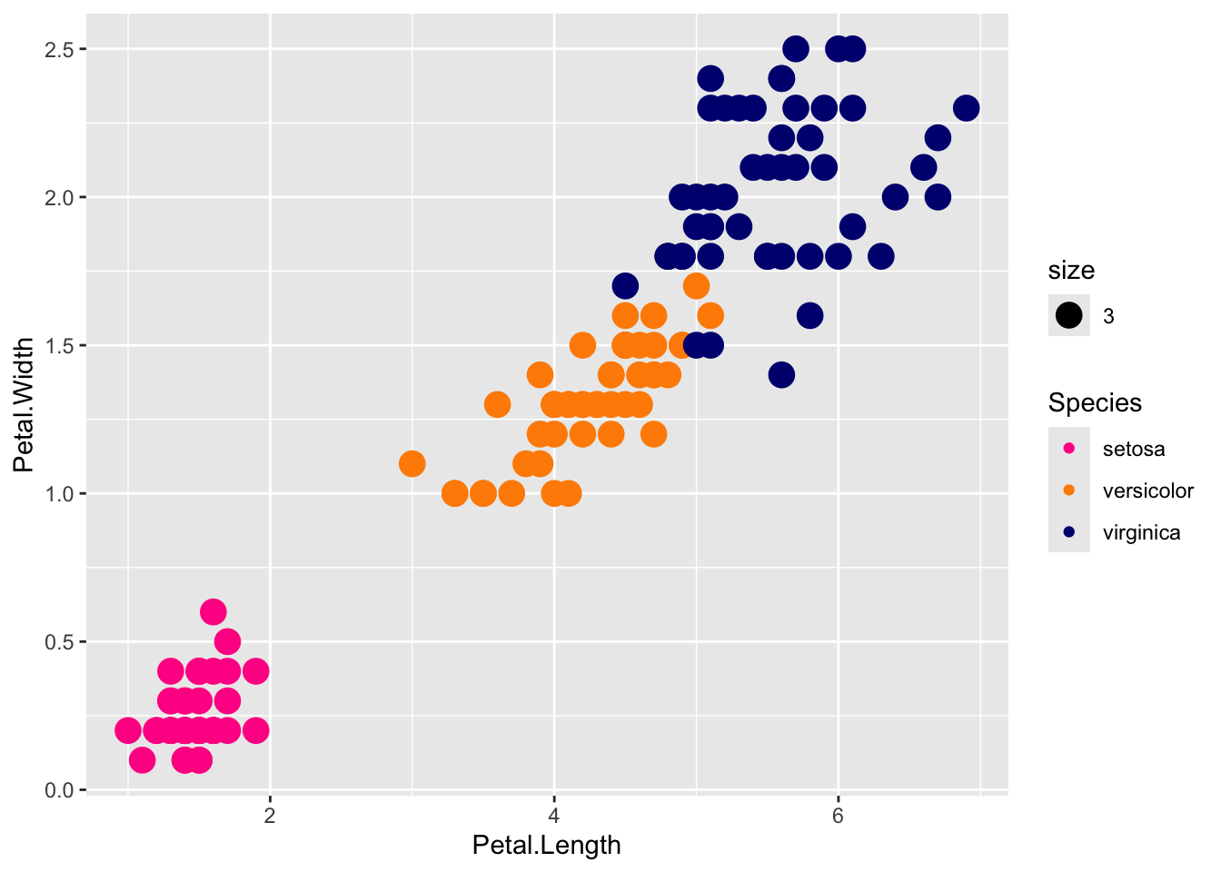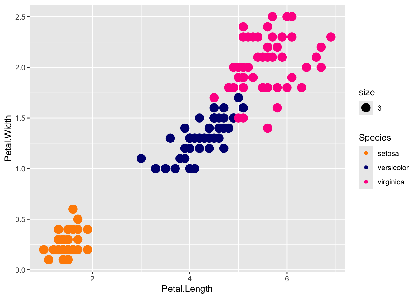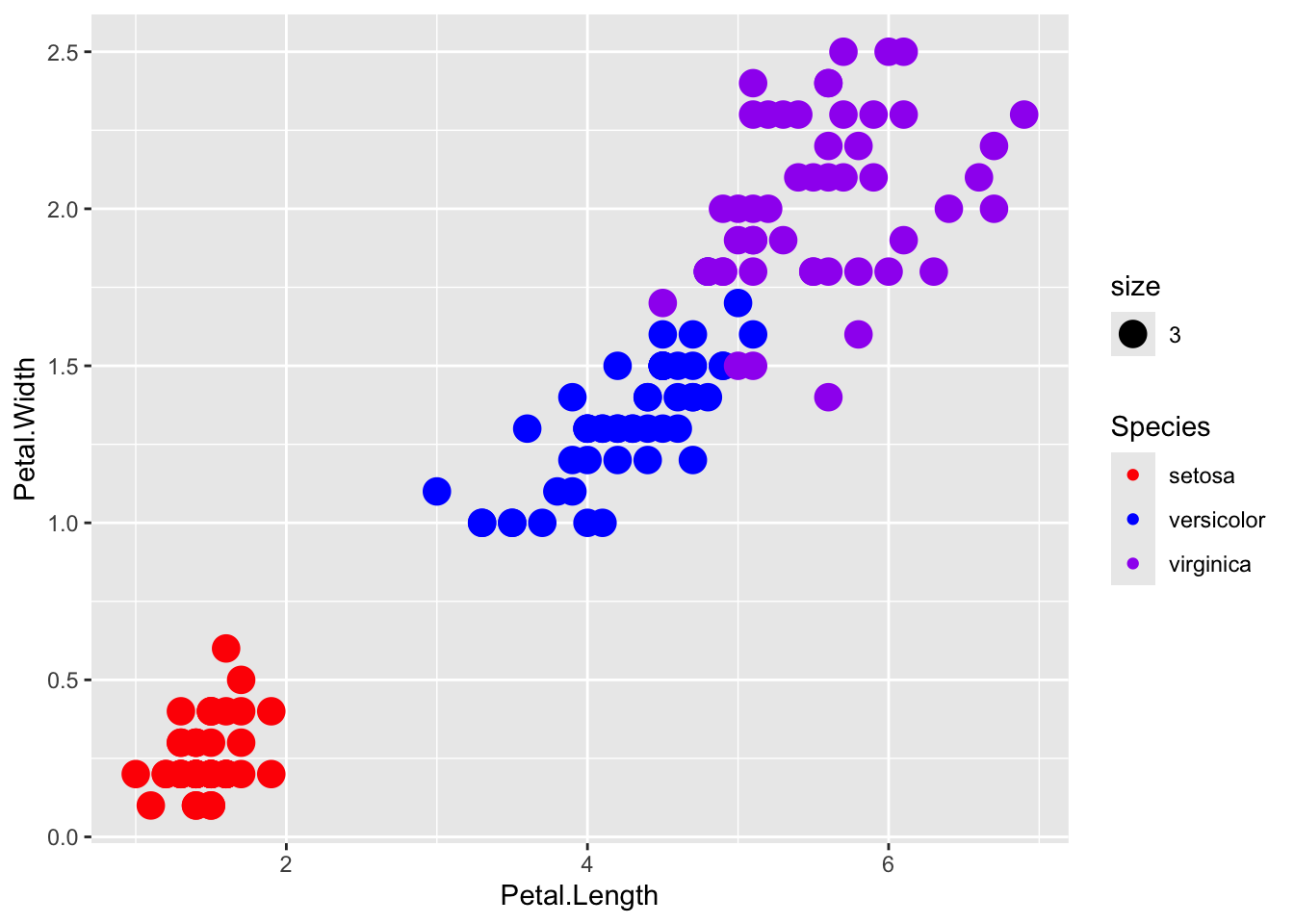 ggplot2 automatically adds a legend that maps color to species. To remove the legend we set the geom_point() argument show.legend = FALSE.