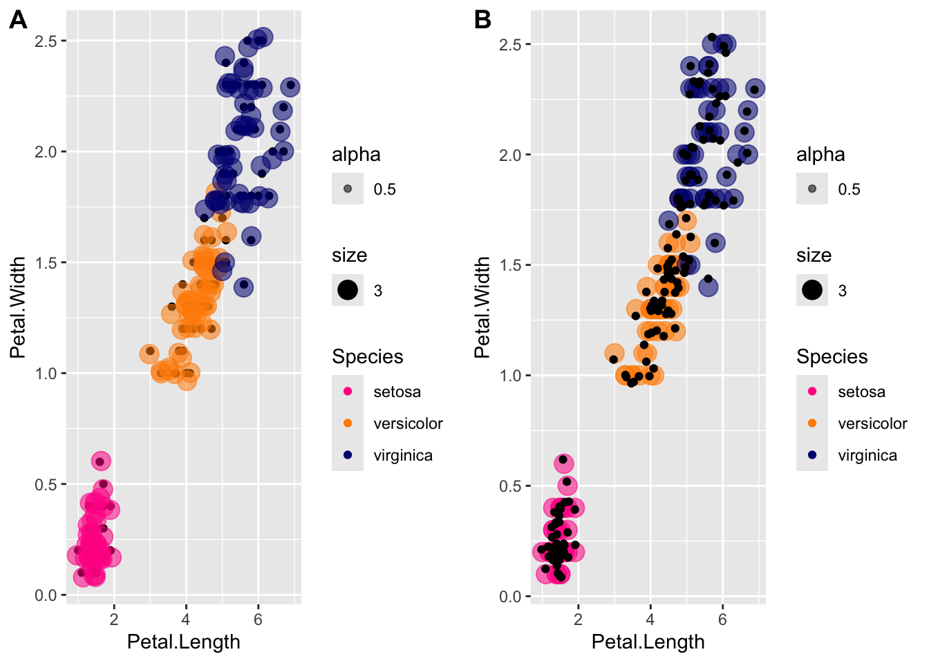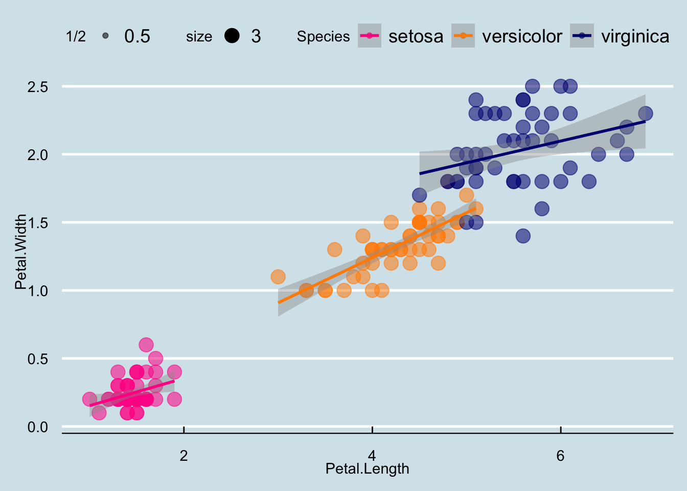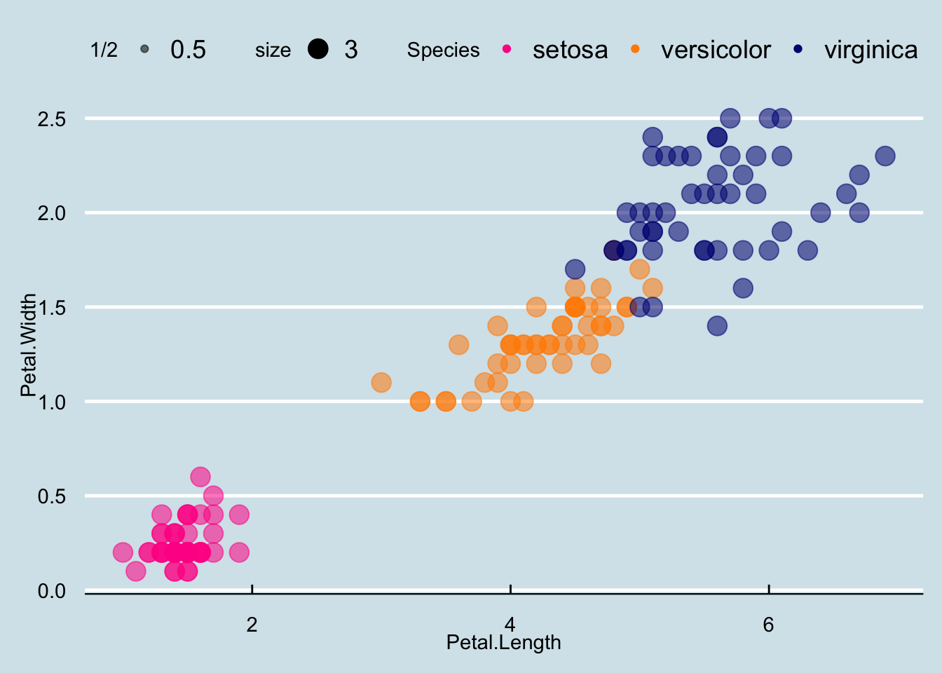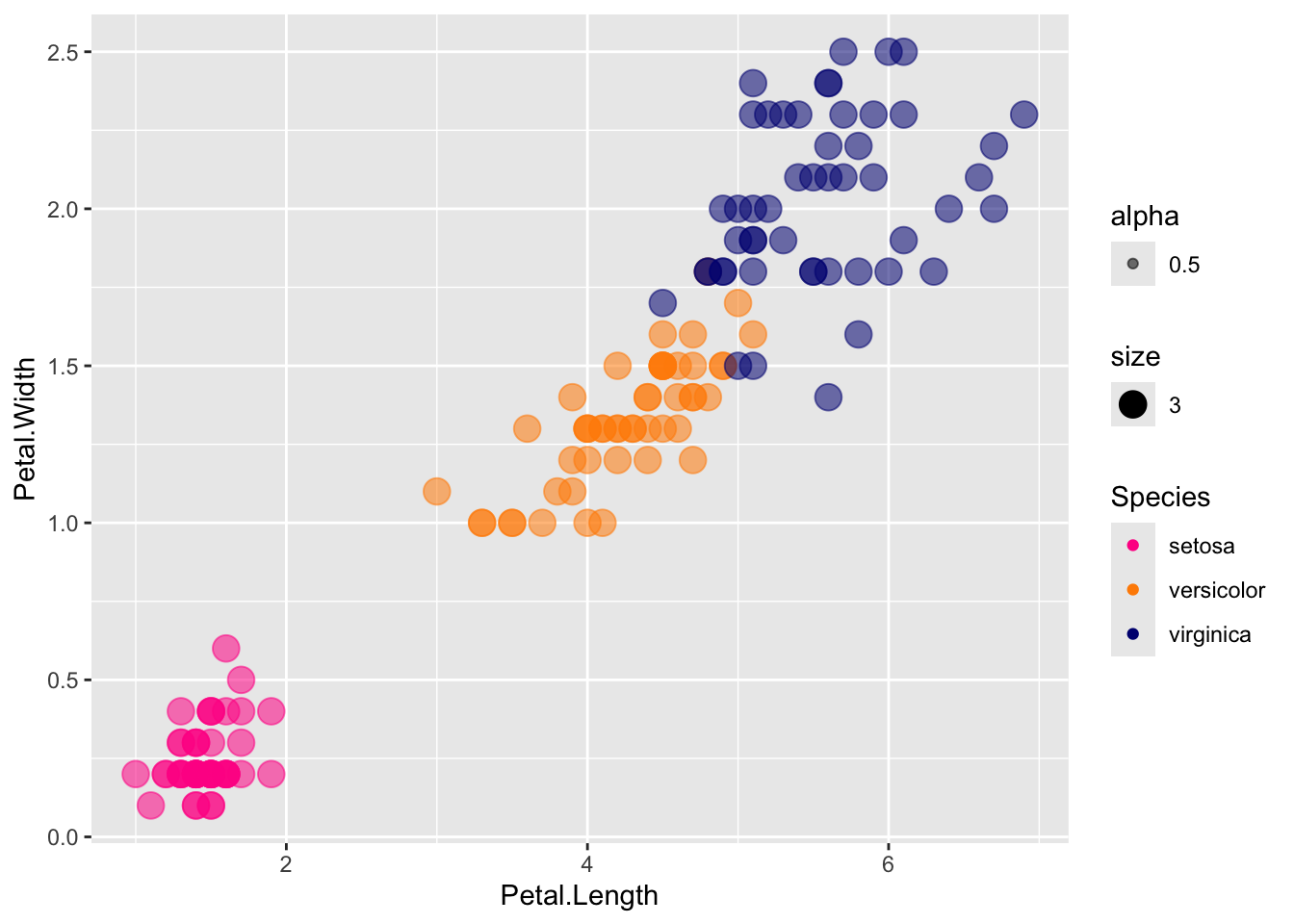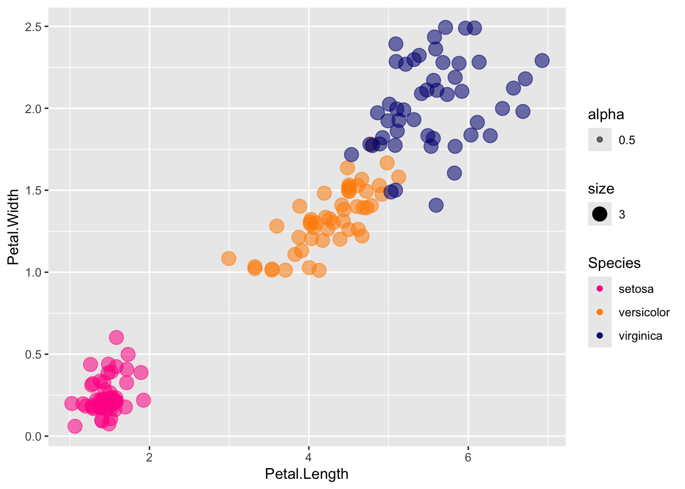 p + geom_point(aes(col=Species, size = 3, alpha = 1/2)) +