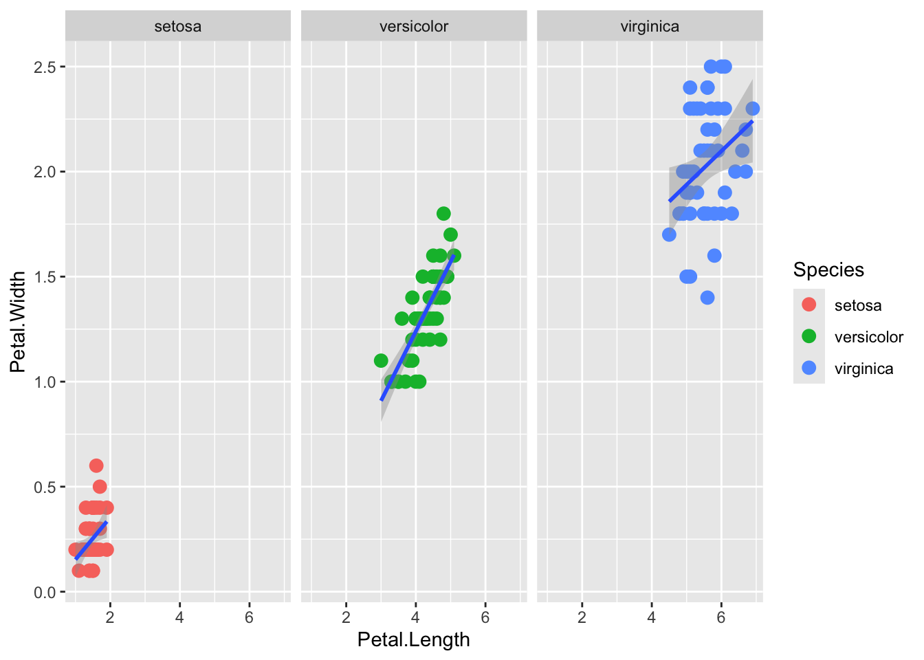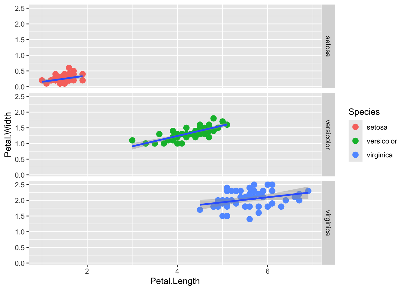 facet_grid(. ~ Species)`geom_smooth()` using formula = 'y ~ x'