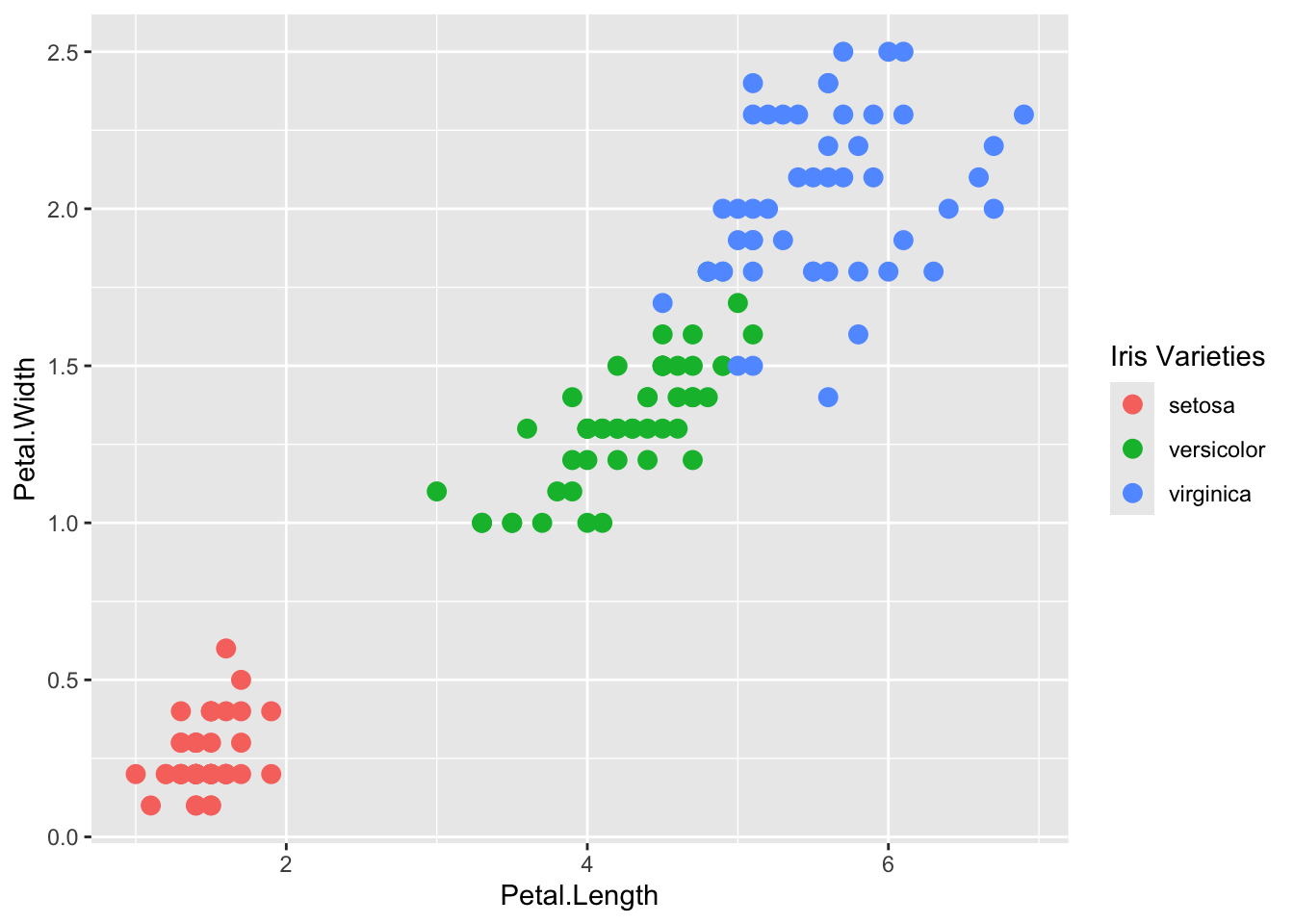 p + geom_point(aes(Petal.Length, Petal.Width))Nothing else was specified, so the scale and labels are defined by default when adding this layer. aes uses the variable names from the vectors within the data object: we donʻt have to call them as iris$Petal.Length and iris$Petal.Width.