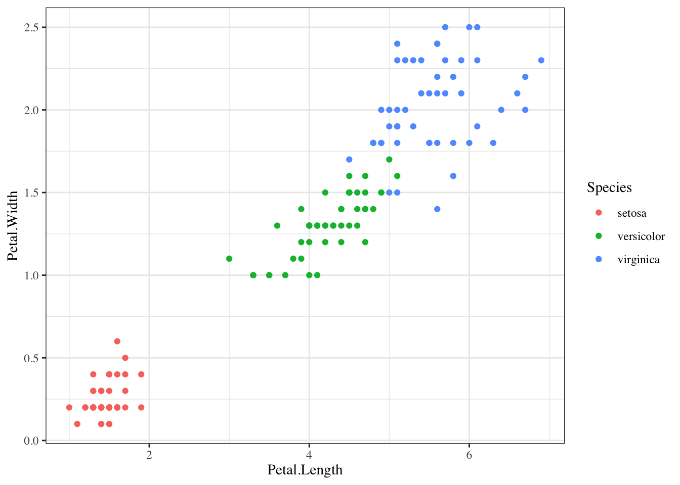iris |> ggplot(aes(x = Petal.Length, y = Petal.Width, col=Species)) +