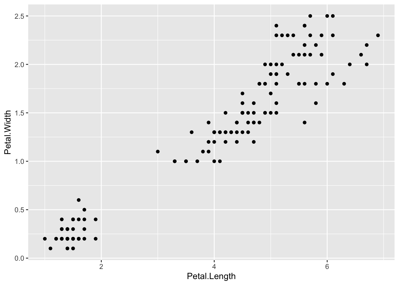 p <- iris |> ggplot(aes(x = Petal.Length, y = Petal.Width))