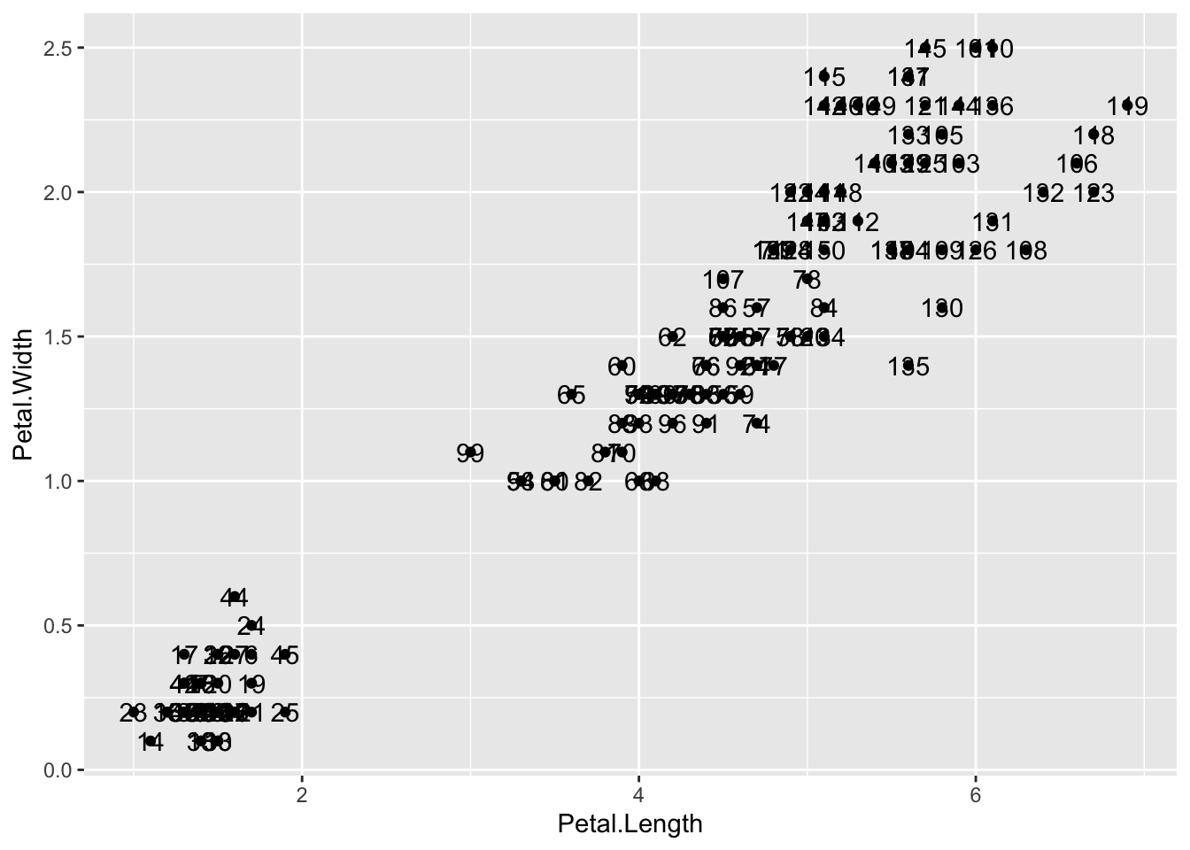 geom_text(aes(Petal.Length, Petal.Width, label = id))