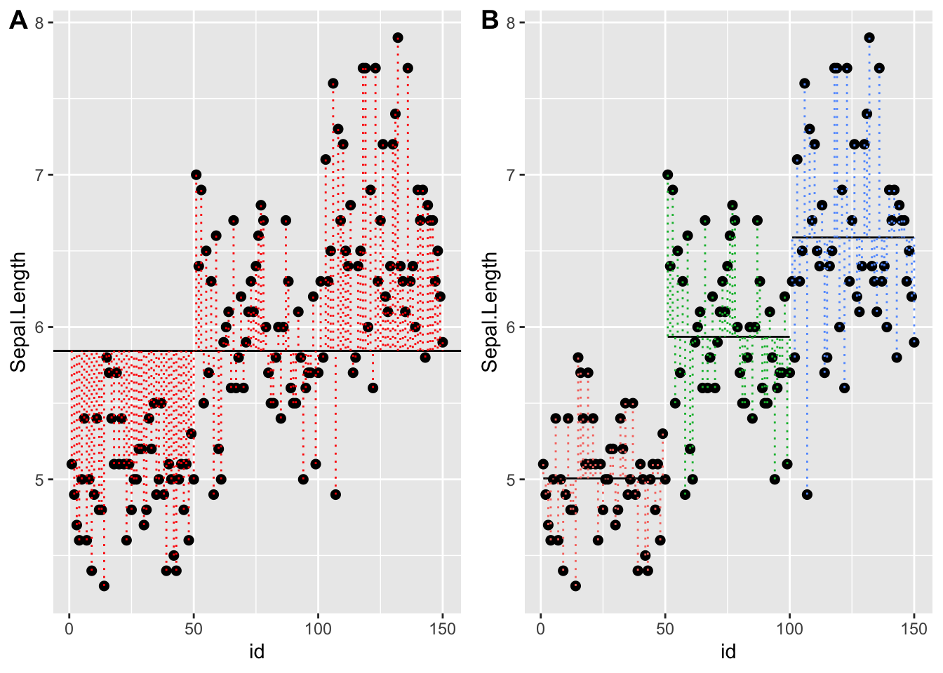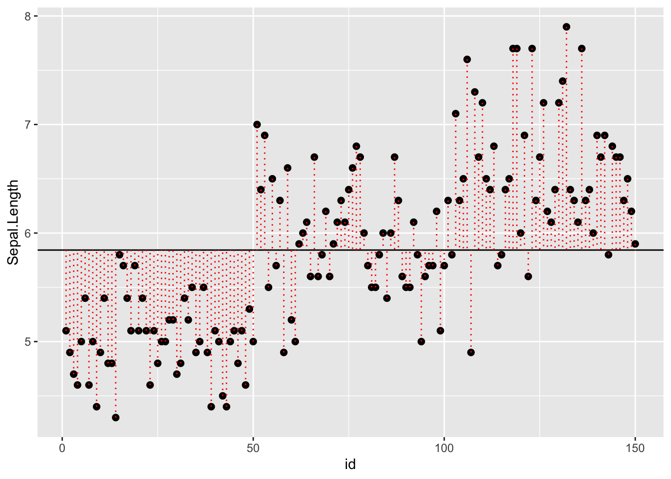 geom_segment( data=dat, aes( x = id, y = Sepal.Length, xend = id, yend = yhat), color="red", lty = 3)