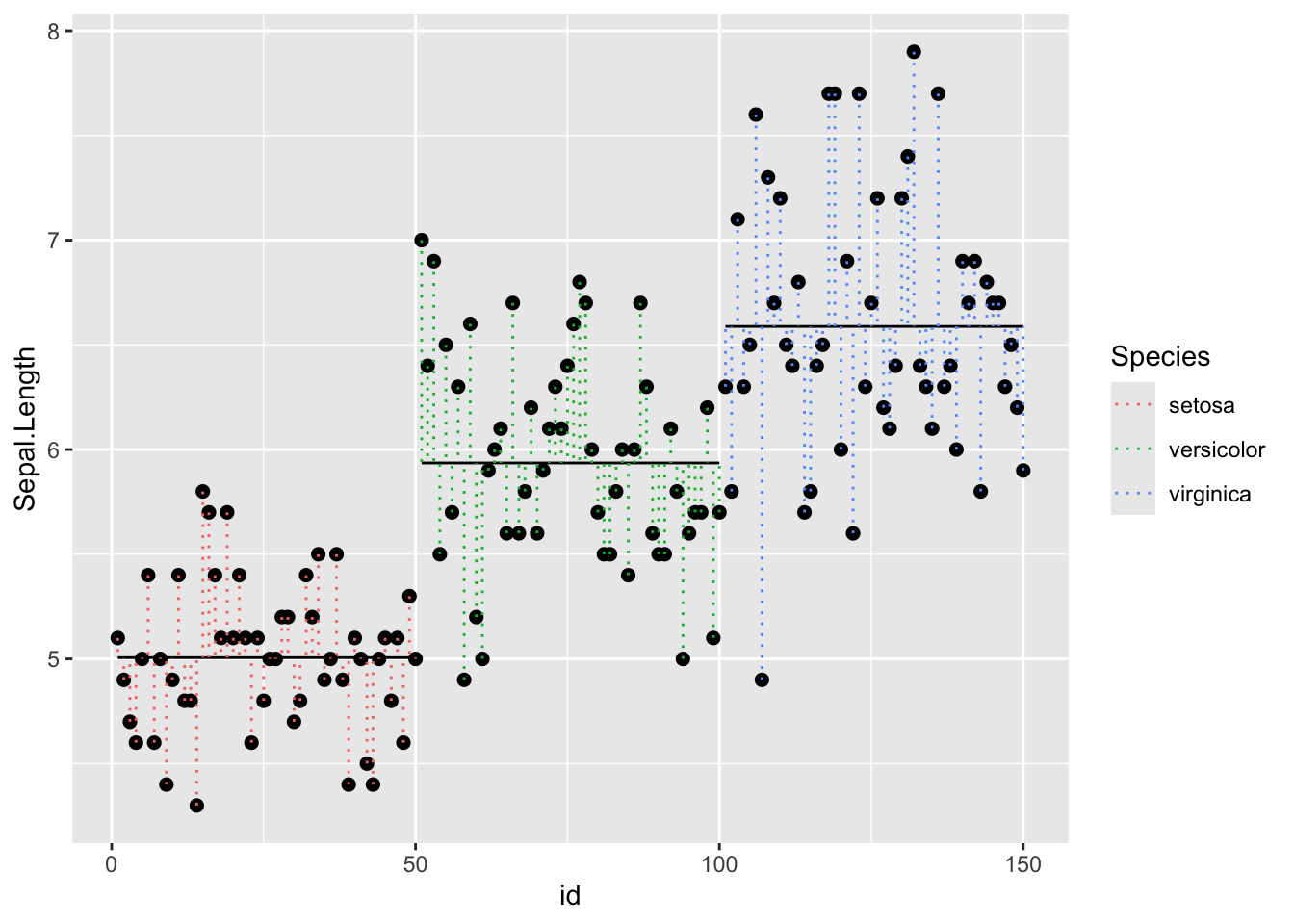 geom_segment( data=dat, aes( x = id, y = Sepal.Length, xend = id, yend = sl, color=Species), lty = 3)