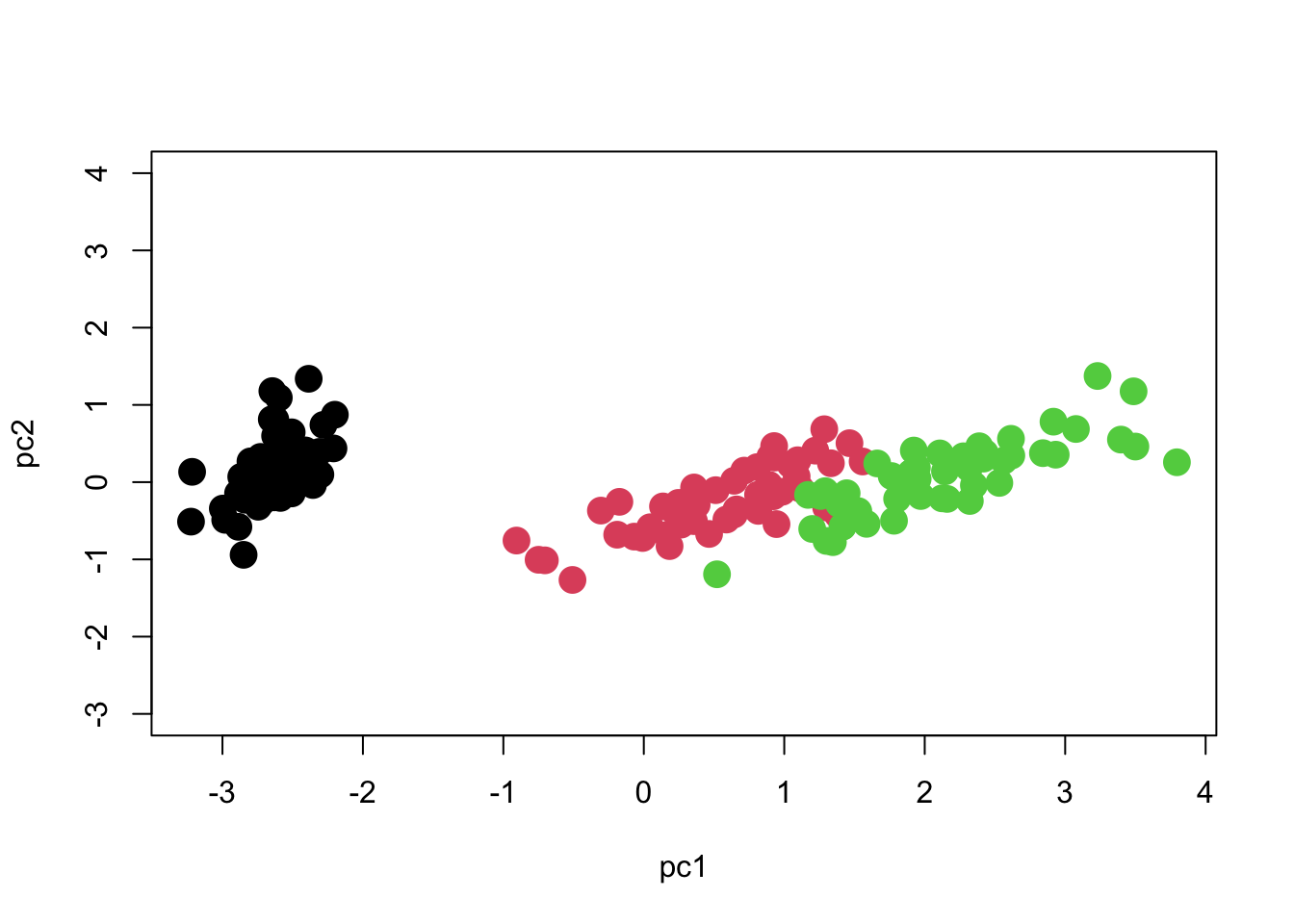 plot(pc2 ~ pc1, col=iris$Species, cex=2, pch=16)