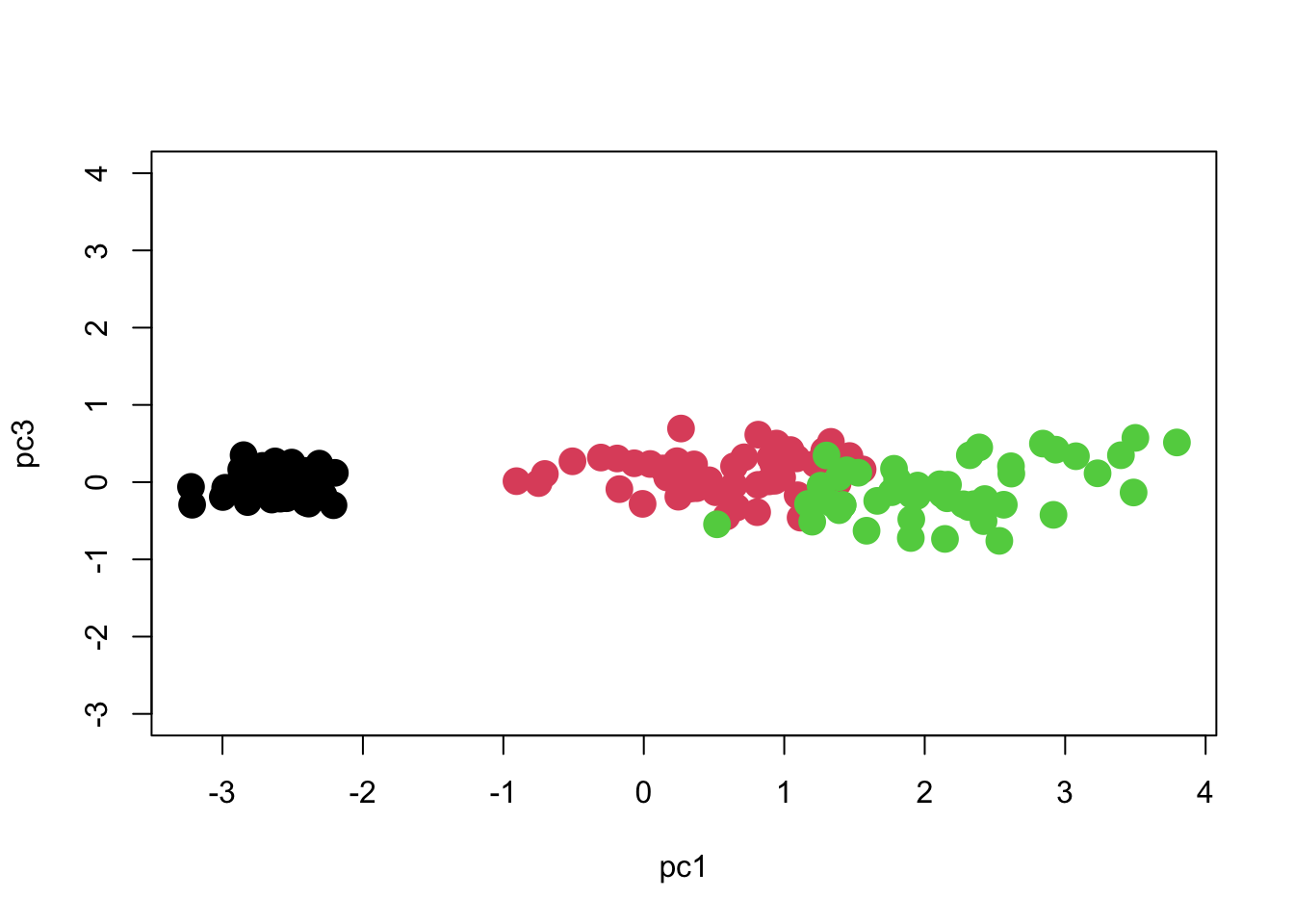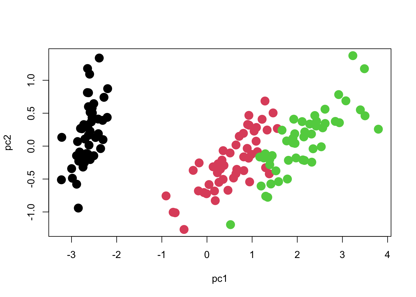 We can see that there are three distinct groups of points. PC1 seems to contribute the most to separating the species, whereas PC2 seems to reflect variation within species.