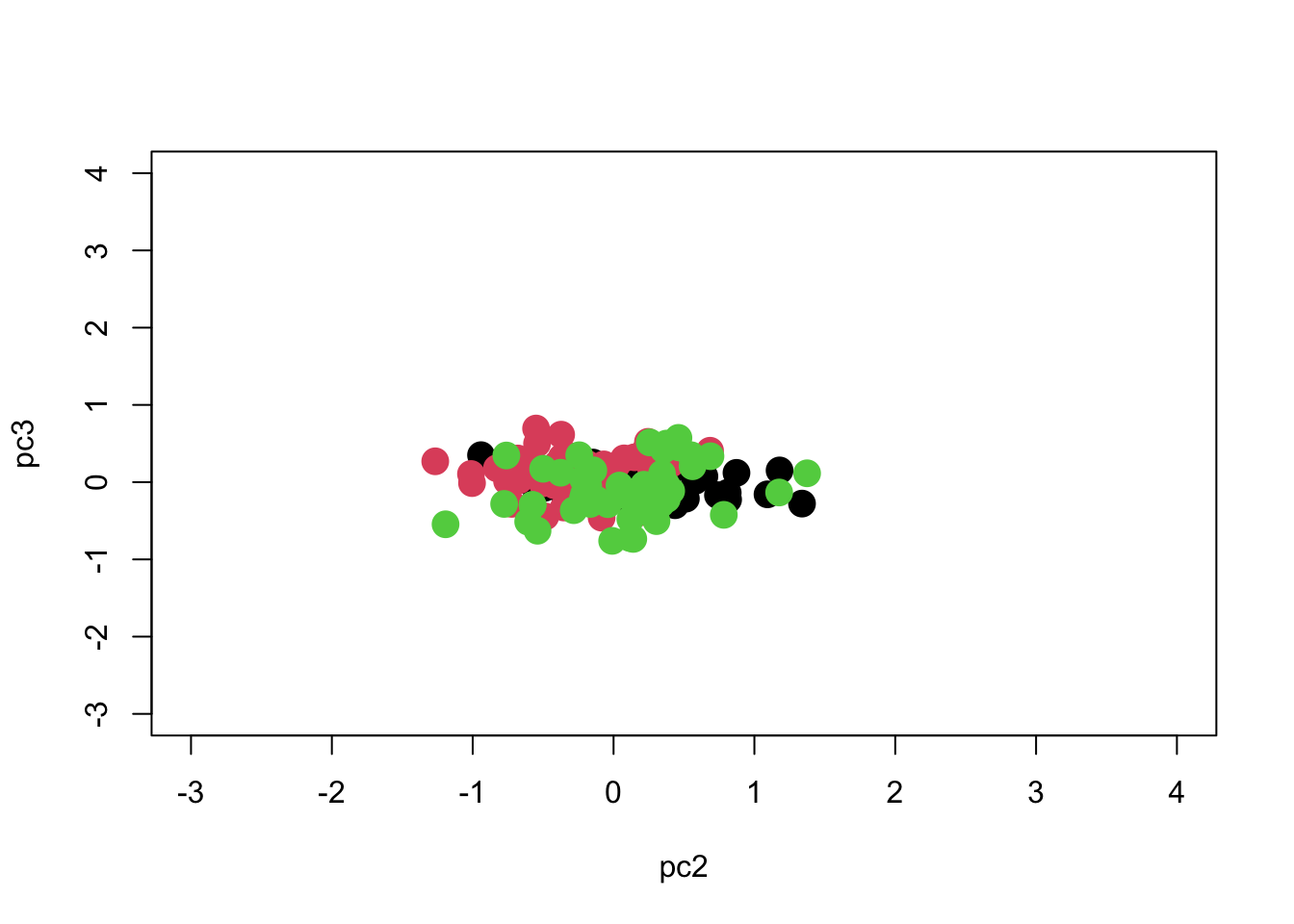 So we see that most of the separation is achieved along PC1, and we can separate the groups pretty well if we just use PC1 with PC2 or PC3. We can see if the separation is significant using MANOVA: