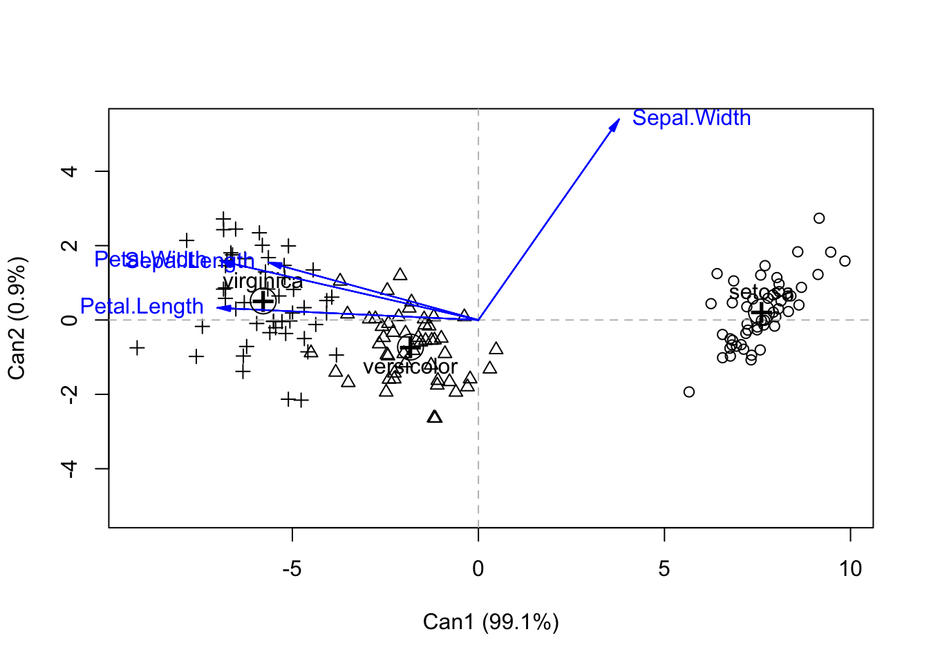 plot(iris.can, col=as.numeric(iris$Species))Vector scale factor set to 7.122