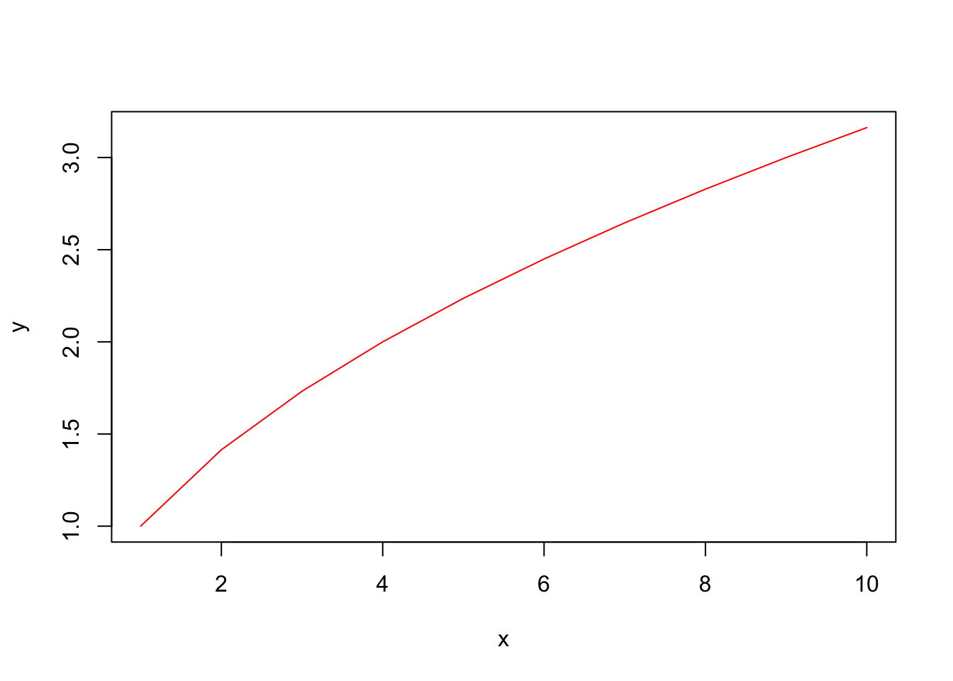 myfun( 1:10, sqrt(1:10), col="red", type="l")