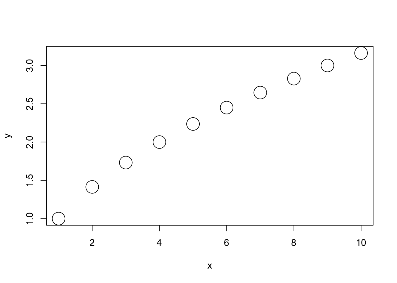 myfun( 1:10, sqrt(1:10), cex=3) # optional arg for point size passed to plot()