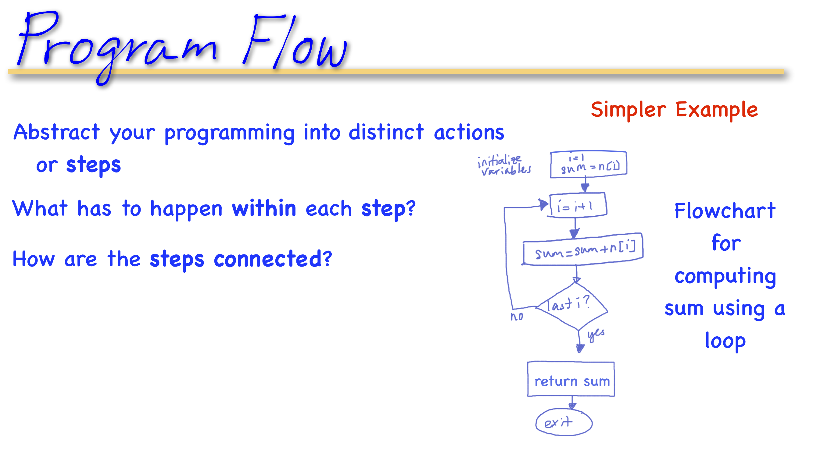 A flowchart can be really helpful for visualizing your computations, and in particular where a function or loop would be helpful, or where variables need to be updated or sent to output. For example for computing the sum using a loop: