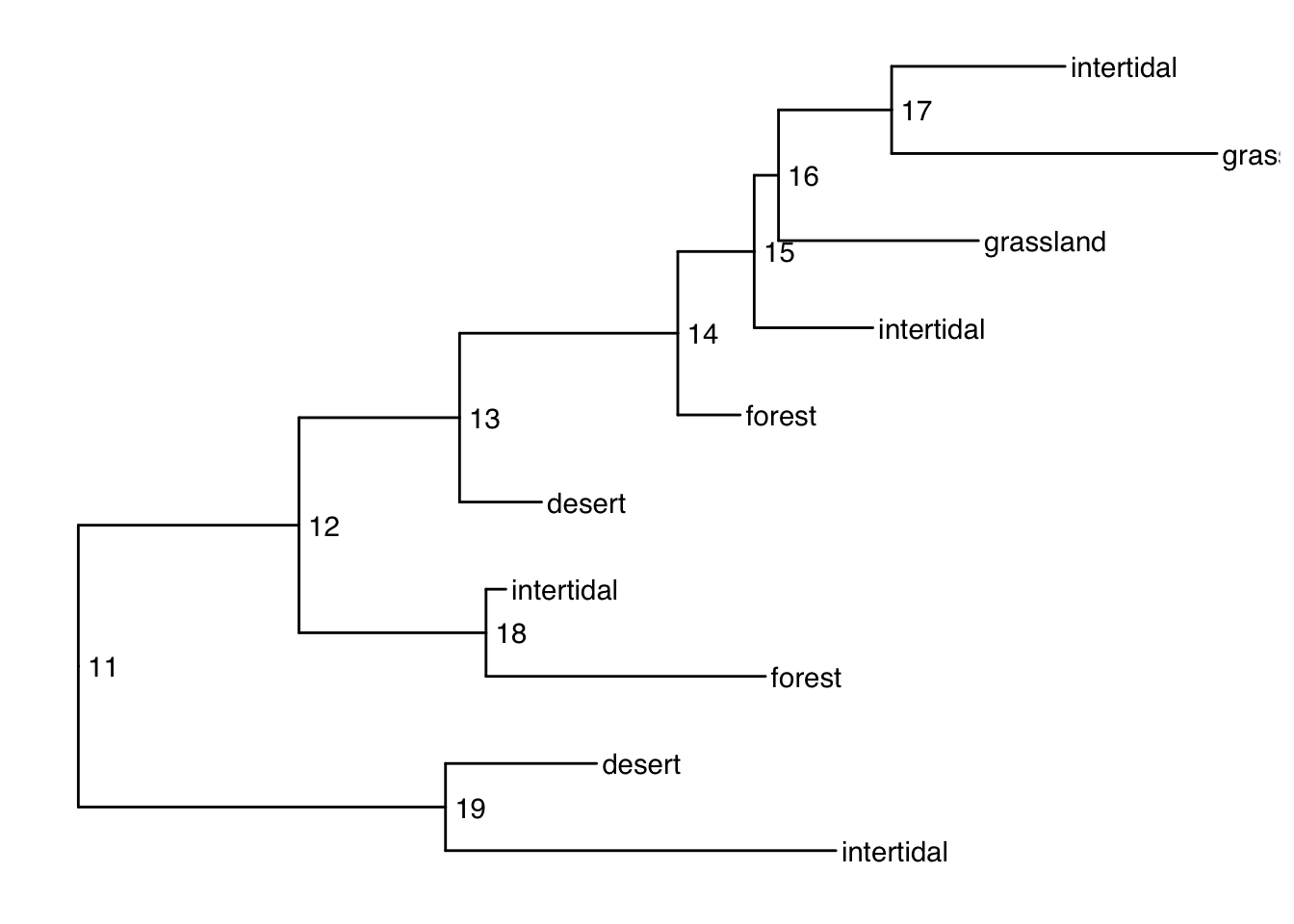 habitat <- sample(c("desert", "grassland", "forest", "intertidal"), size=n, replace=T)
