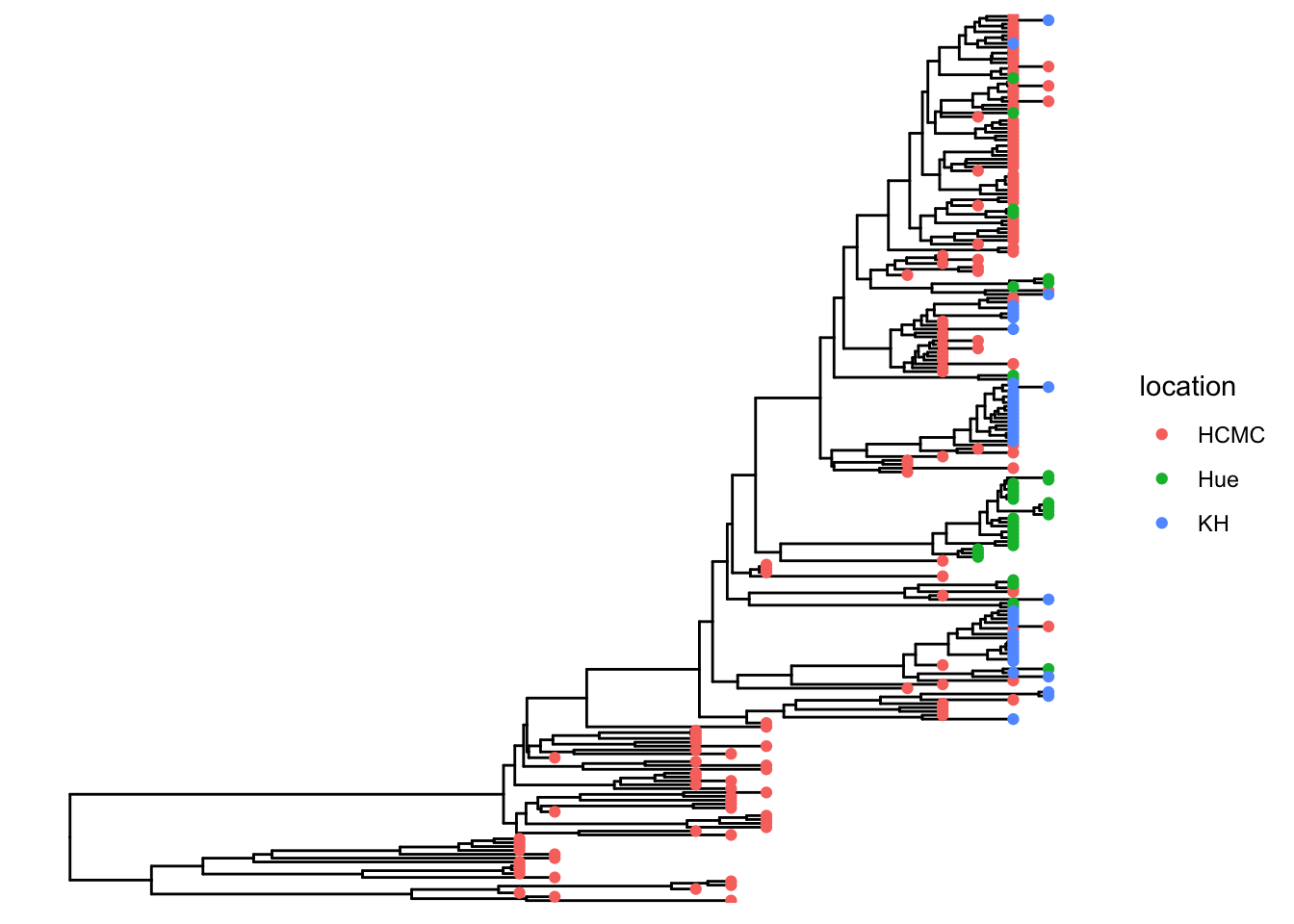 p <- p %<+% df_info + geom_tippoint(aes(color=location))