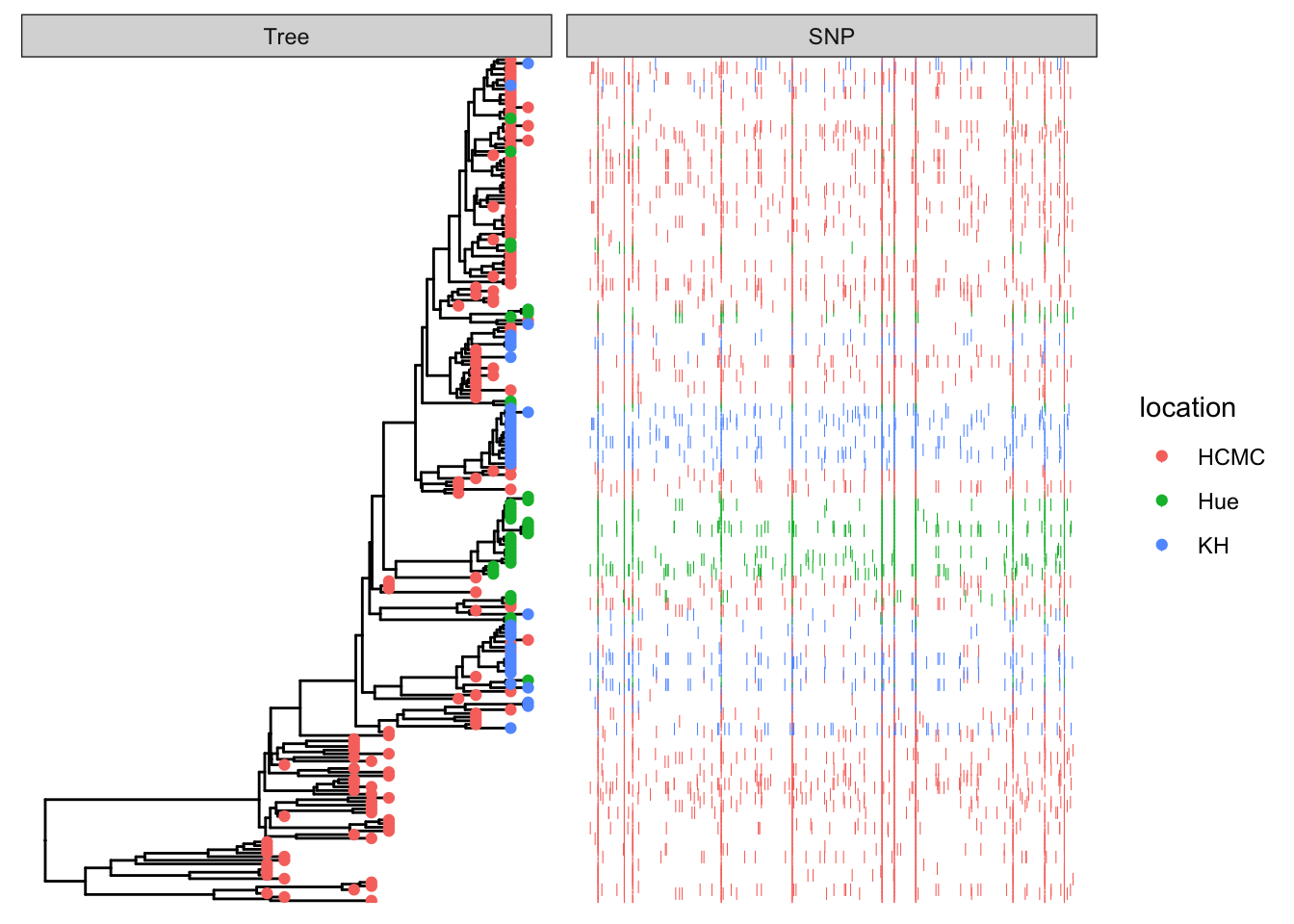 In the dataframe snp_data the rows are ordered by position along the sequence (the x-dimension of this data), but the first column is the strain (taxon) name which matches the tips in the phylogenetic tree.